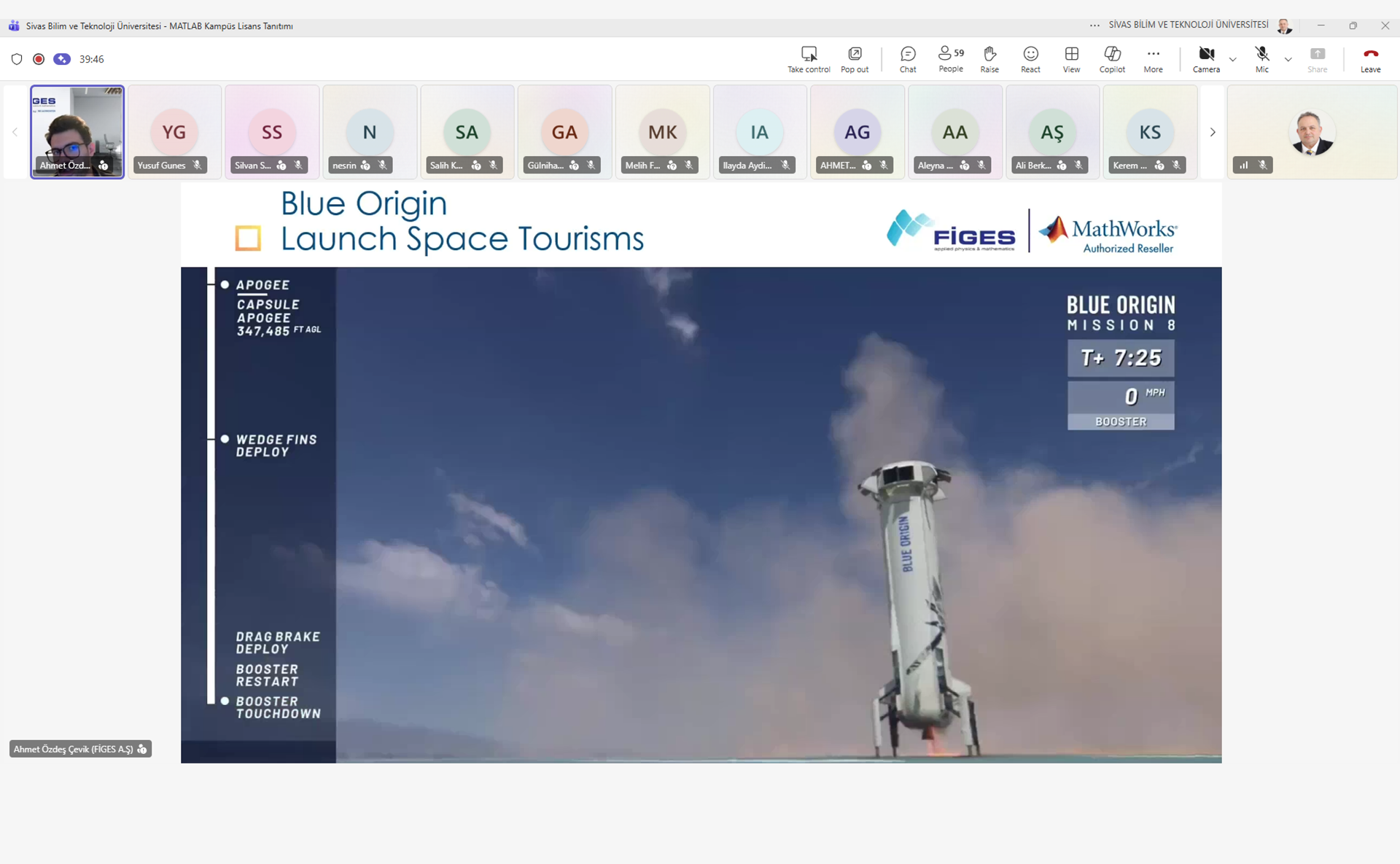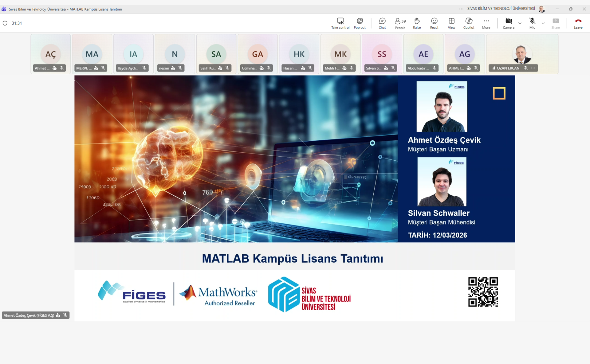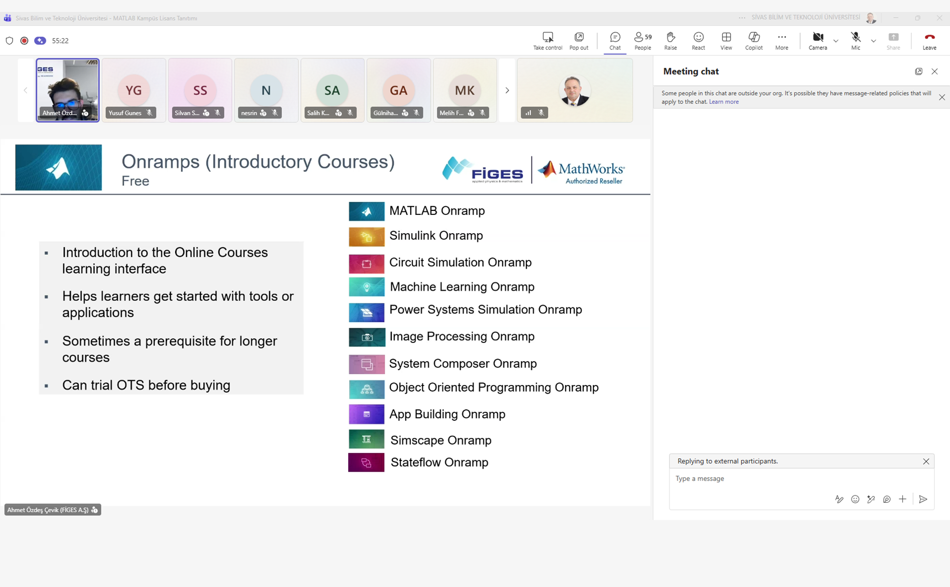 Çevrim içi (online) platformda 16.31 – 17.30 saatleri arasında düzenlenen programda, FİGES Müşteri Başarı Uzmanı Ahmet Özdeş Çevik ve FİGES Başarı Mühendisi Silvan Schwaller sunumlarını gerçekleştirdi. Etkinlikte, dünya genelinde mühendislik ve bilimsel araştırmaların temel taşı sayılan MATLAB uygulamasının teknik yetkinlikleri ve kampüs lisansının sunduğu imkânlar detaylandırıldı.